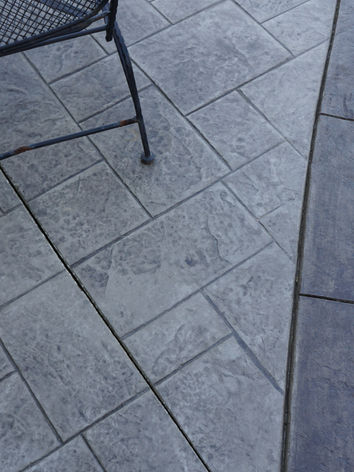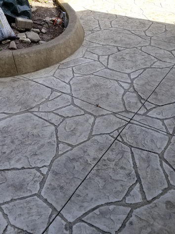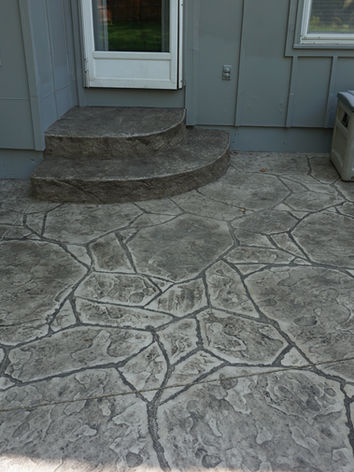 This project features a slate stamped concrete patio in a gray tone with nutmeg accents, creating a clean, natural stone appearance. The design includes a curved seating wall, adding both function and visual interest while defining the outdoor space. Located in Overland Park, KS.