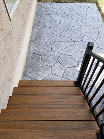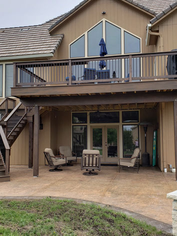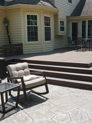 This project features a stamped concrete patio installed beneath an elevated deck, creating a functional and shaded outdoor living space. The layout provides a comfortable area for seating and entertaining while maximizing the space below. Located in Lenexa, KS.