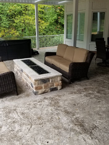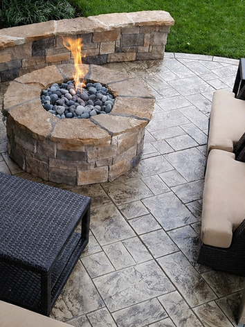 This project features a stamped concrete patio with a flagstone finish, creating a natural stone appearance with added durability. The design includes a built-in fire pit, offering a comfortable and inviting outdoor gathering space. Located in Shawnee, KS.