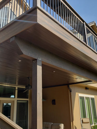 This project features Trex Enhance Naturals in Rocky Harbor with a Coastal Bluff border, creating a clean, two-tone aesthetic. The deck is complemented by a black Trex Select railing system, adding contrast while maintaining a modern, polished look. Located in Leawood, KS.