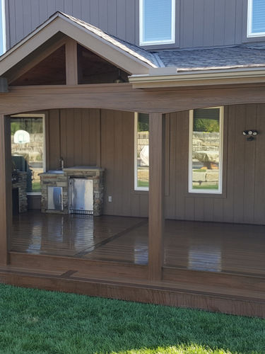 This project features two decks built with Trex Transcend in Havana Gold with a Spiced Rum border, creating a warm, cohesive look. The decks are complemented by a black railing system, adding a bold contrast while enhancing the elevated poolside setting. Located in Leawood, KS.